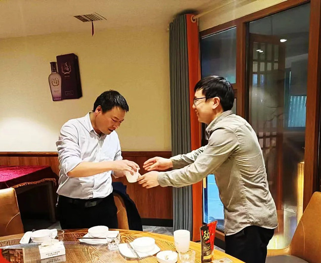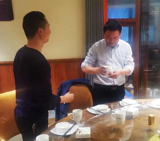 在宴會上,劉洋、丁永繼兩位徒弟向師傅劉美林總經(jīng)理行拜師禮——首先向師傅深深鞠躬:表示在今后的工作中一定誠心、細心、虛心地向師傅學(xué)習(xí)請教。盡己所能處理和解決工作中的常規(guī)問題,遇事多征求師傅意見;同時會多看些企業(yè)管理方面的書籍,也希望在座的各位干部多多指教。接著,兩位向師傅敬茶。